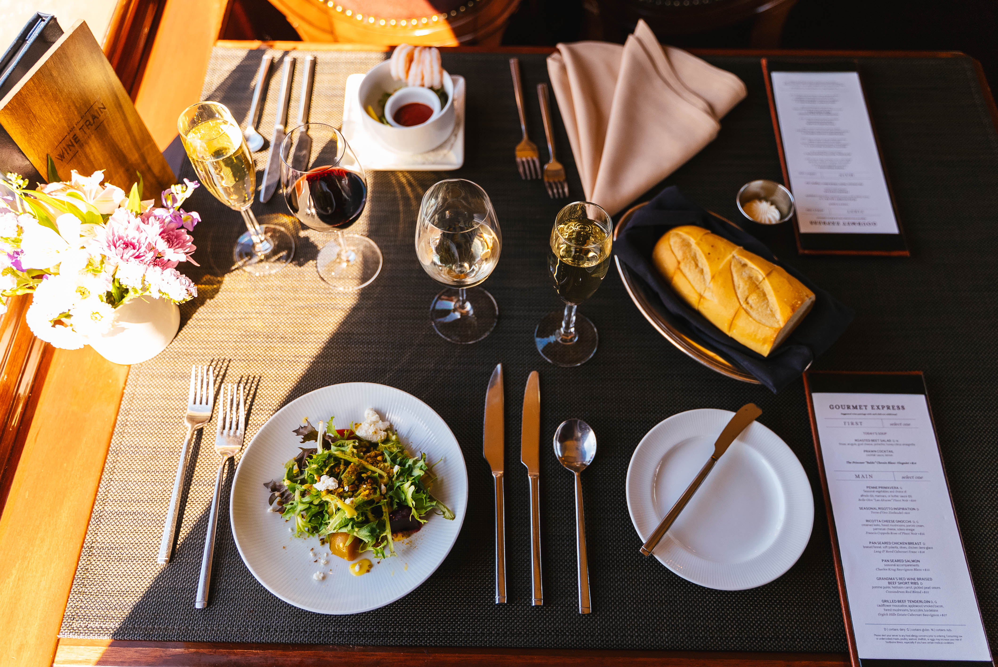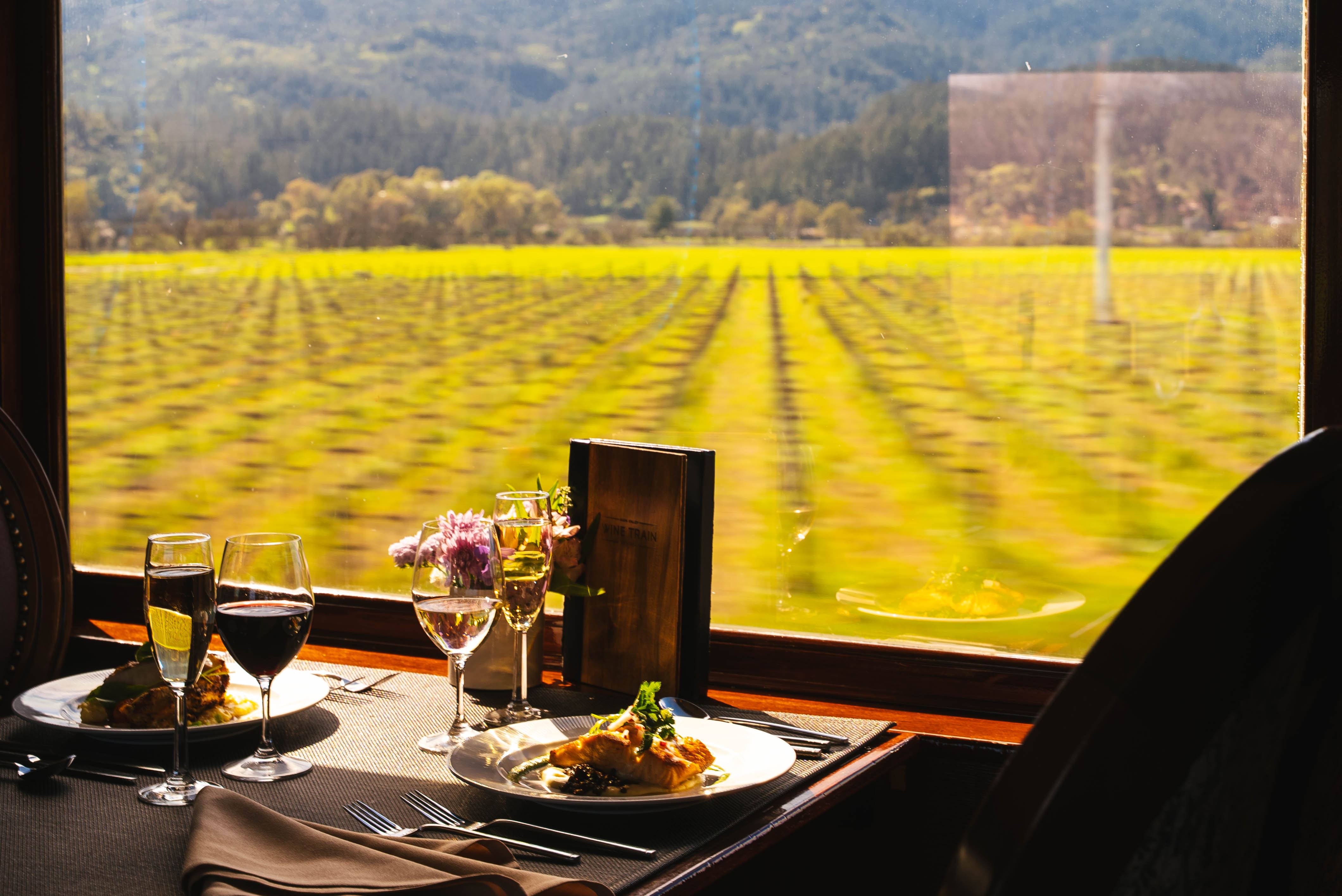 Your day begins with an elegant tranquil train journey northbound through the spectacular Napa Valley aboard our intimate luxury rail car where your gourmet lunch awaits. Welcome taste of sparkling. Soup du Jour or fresh Baby Lettuce Salad. And your choice of gourmet entrées.